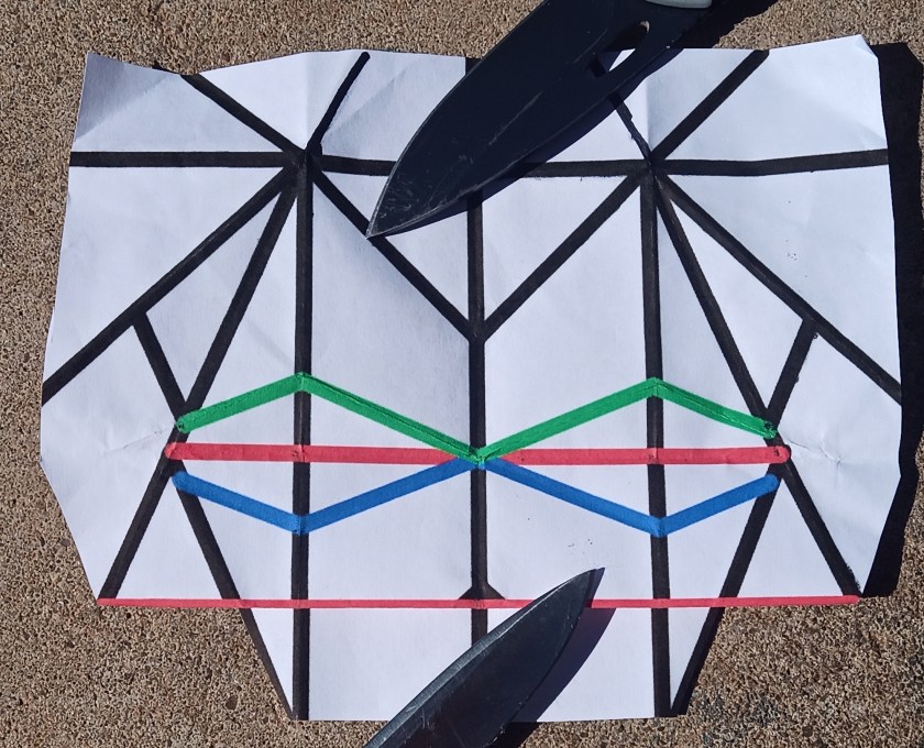 Finding where (most of) the creases are isn’t really the difficult part of the model though, so I have some tips on how to fold it. The model doesn’t specify its folds polarities (mountain or valley), so I want to clarify that my tips are at least somewhat subjective. Also, hope I’m not stepping on any toes by including sections of the original crease pattern.