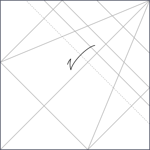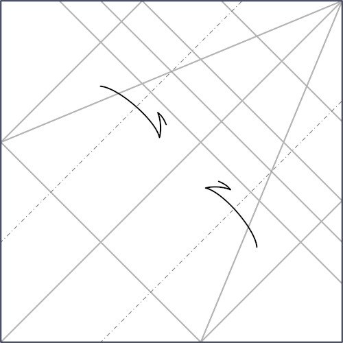 This is a possible way to get the reference lines, but there may be a simpler way. I want to point that out because this model strikes me as having lines in more random places than most crease patterns. That is, it seems more like a model that has steps like in diagramed models. Creases found based on previous steps would be much easier to fold/follow. However, it may just have intentionally difficult to find reference lines for the challenge part.