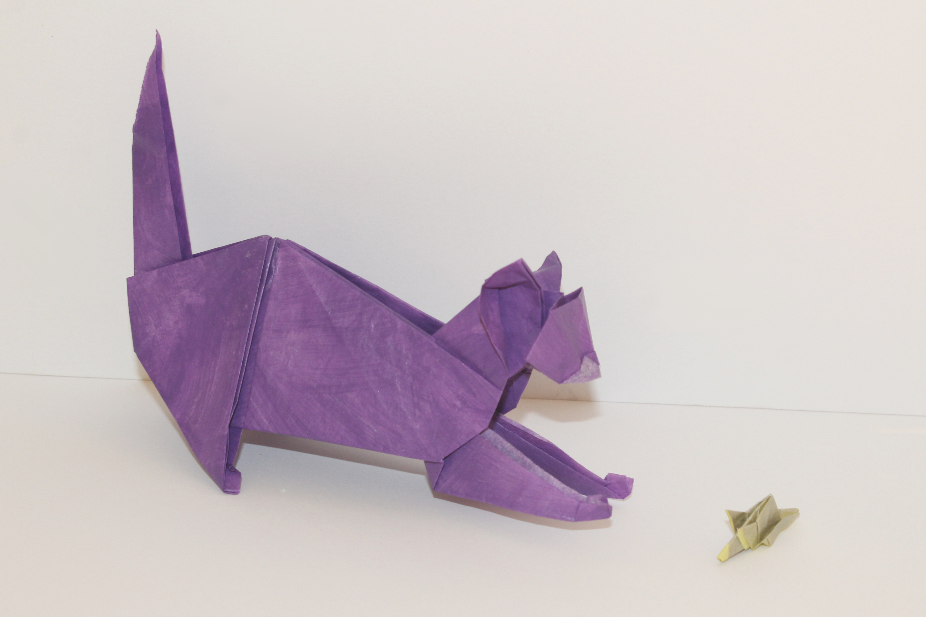 Other than popping out the interior spines and the “watch out for” part, I have a couple other minor tips. The tail section seems to have a few unused points in it (I don’t know why). Finally, a paired set of notes: part of the center square sticks out and the lower body curve doesn’t seem inherent to the crease pattern. For both of these, I crimped the tail down after collapsing, and then folded the extra paper inside pockets in the tail while shaping it.