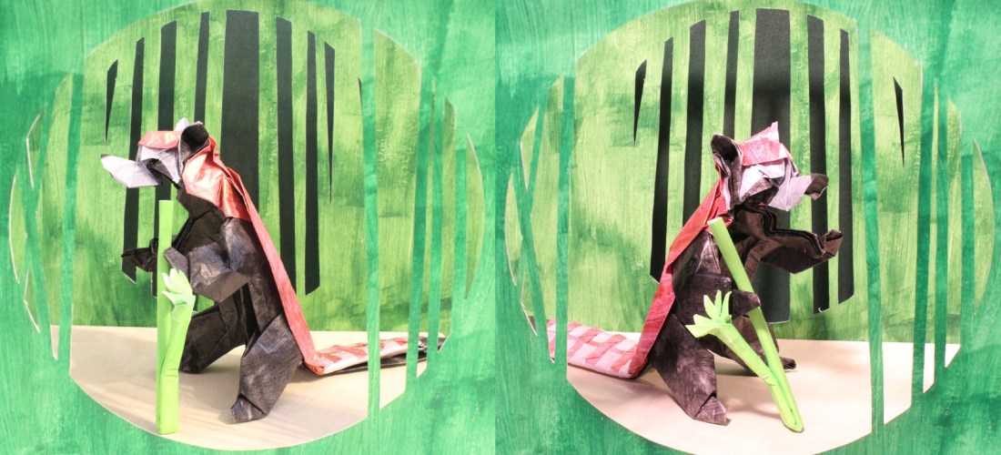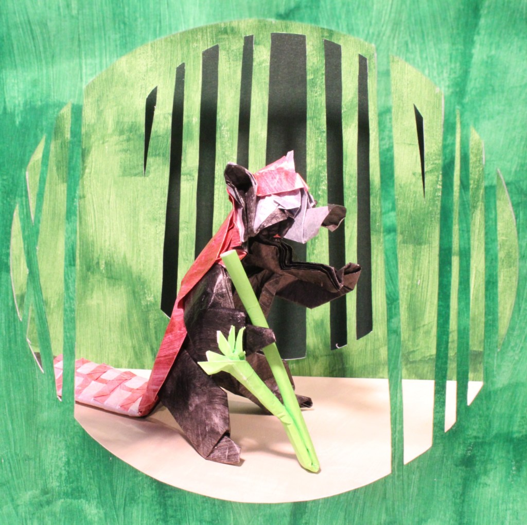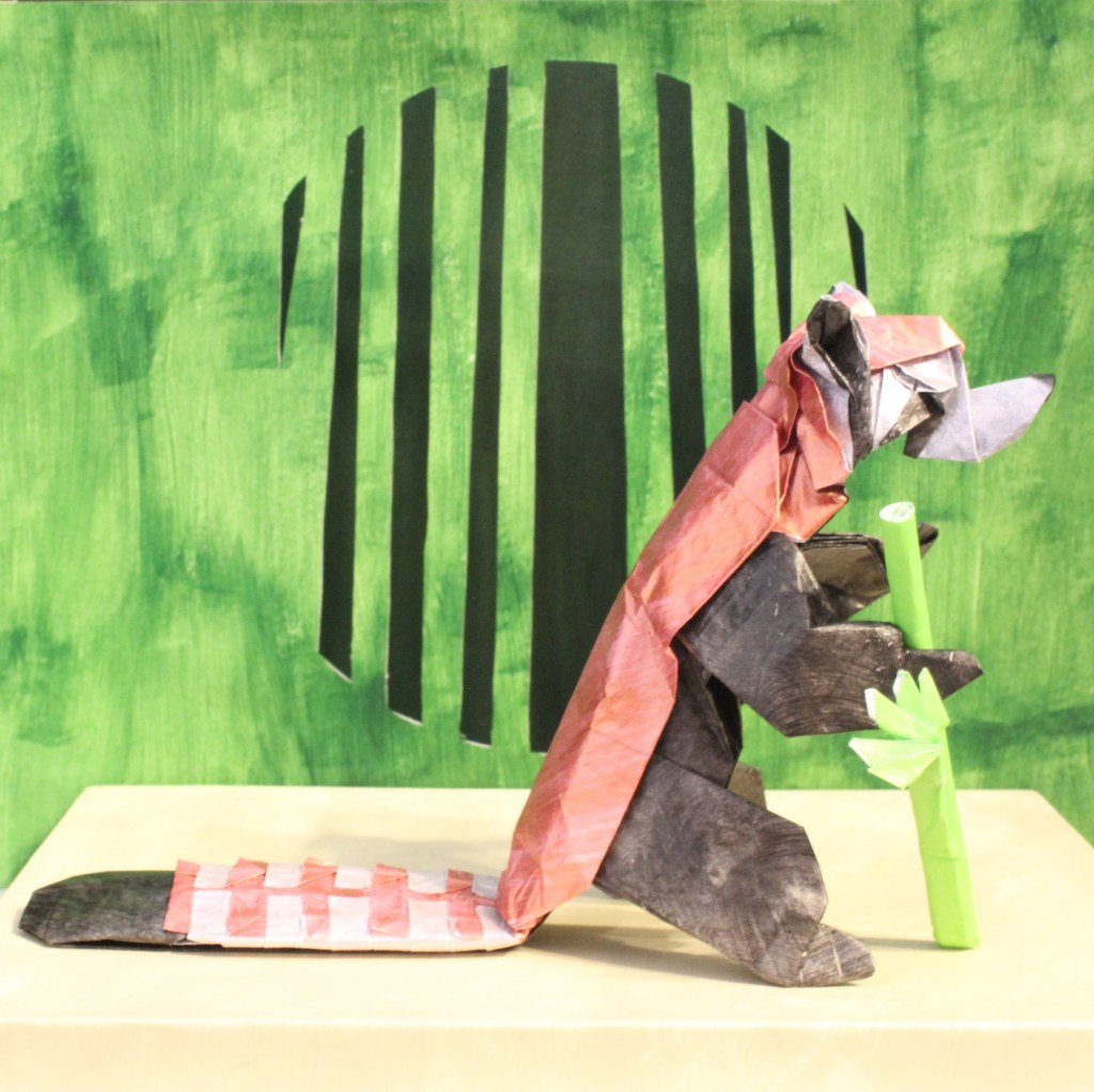 I’ve seen lots of 2 (or more) square origami (like some of the models in “The Beauty of Origami“), but not many complex ones. So I decided to make a semi-complex, 2 square red panda. The white is on both squares, so it’s 3 colours. One square is 2/3rds the other. I think it’s the red one (but I don’t have my notes right now).