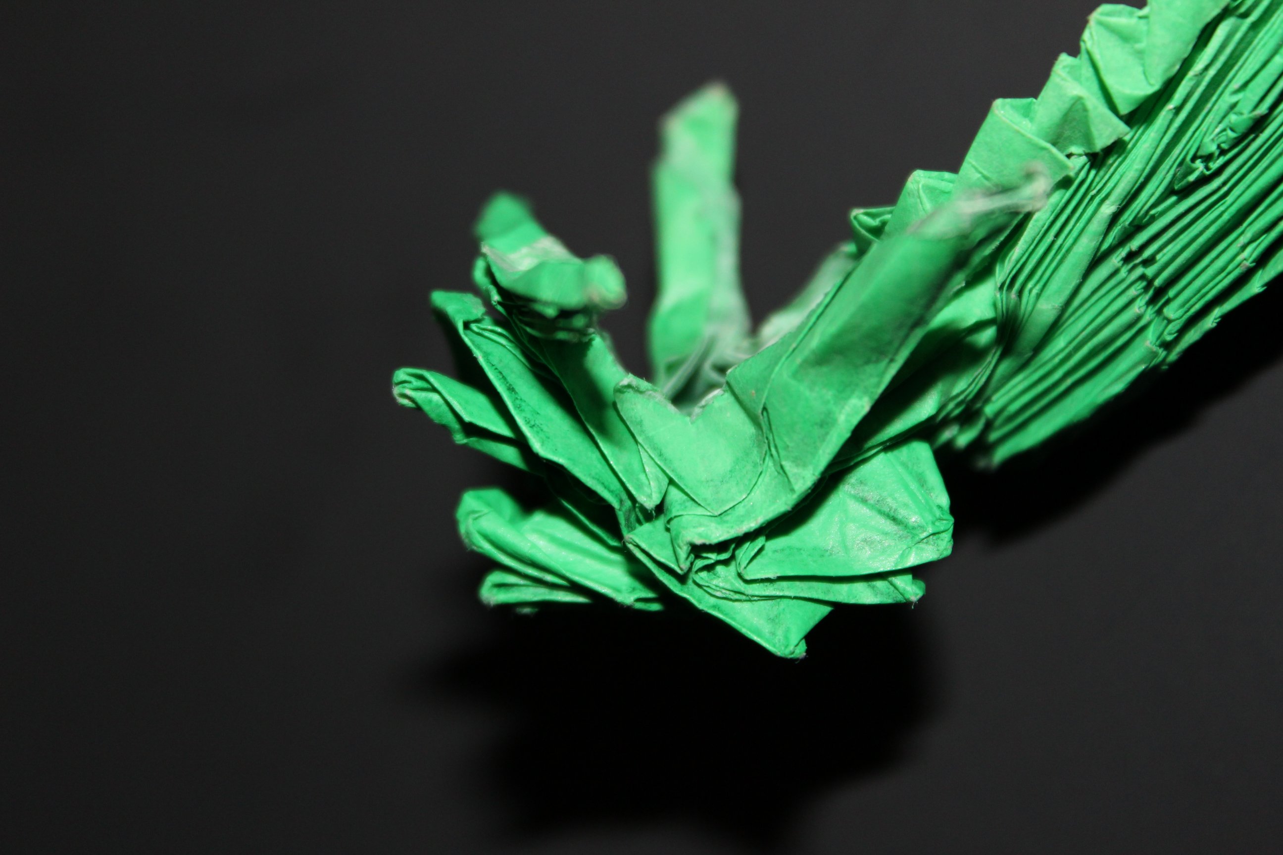 The most recent version is 3.5, and its crease pattern wasn’t released until Kamiya’s Challenge book in 2010 (not counting exhibitions). It’s quite detailed (the crease pattern had to be put on the inside of the book jacket), and the book has some tips on folding portions of the dragon, such as the scales. This model took me quite a while, and I didn’t even articulate all of the scales.