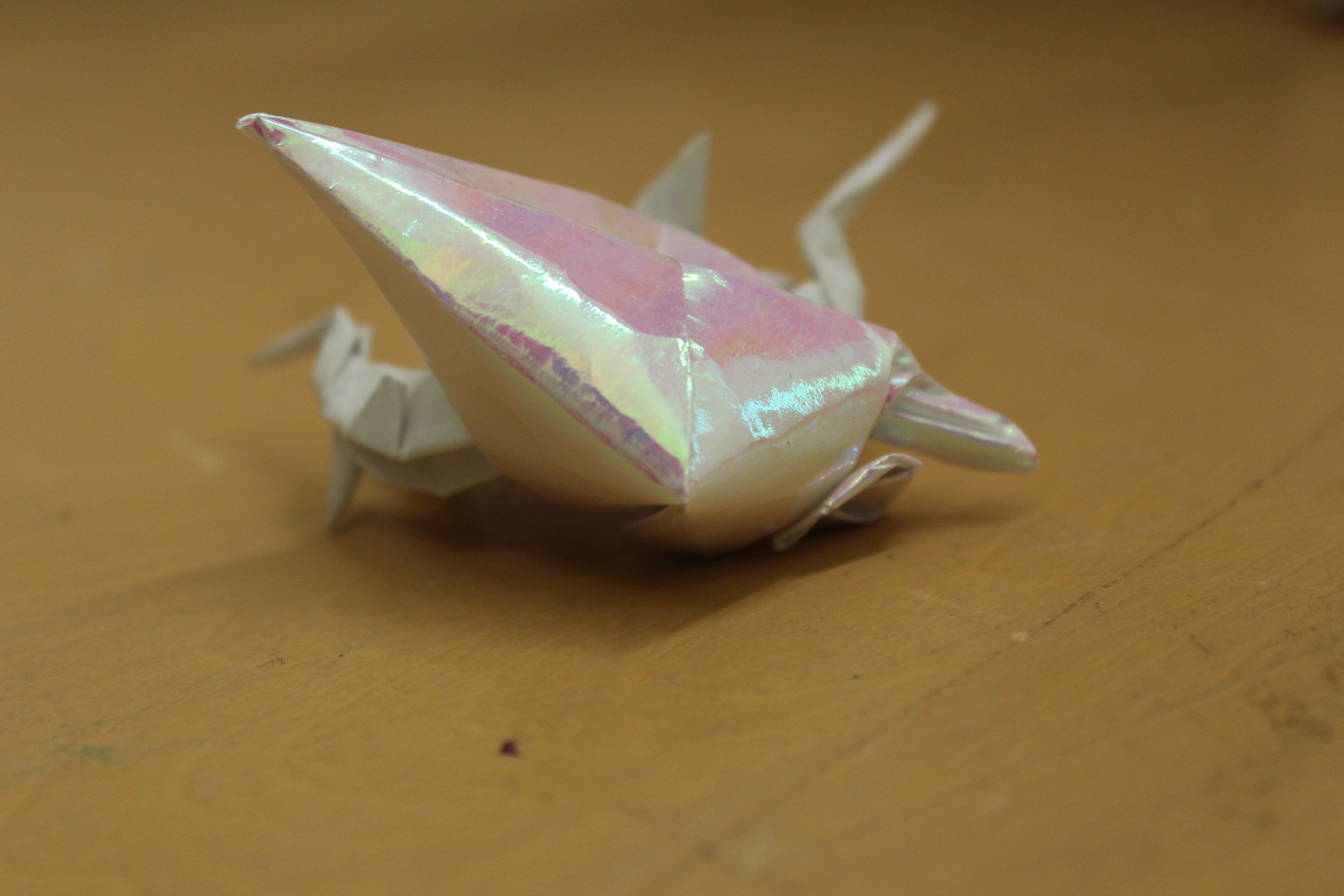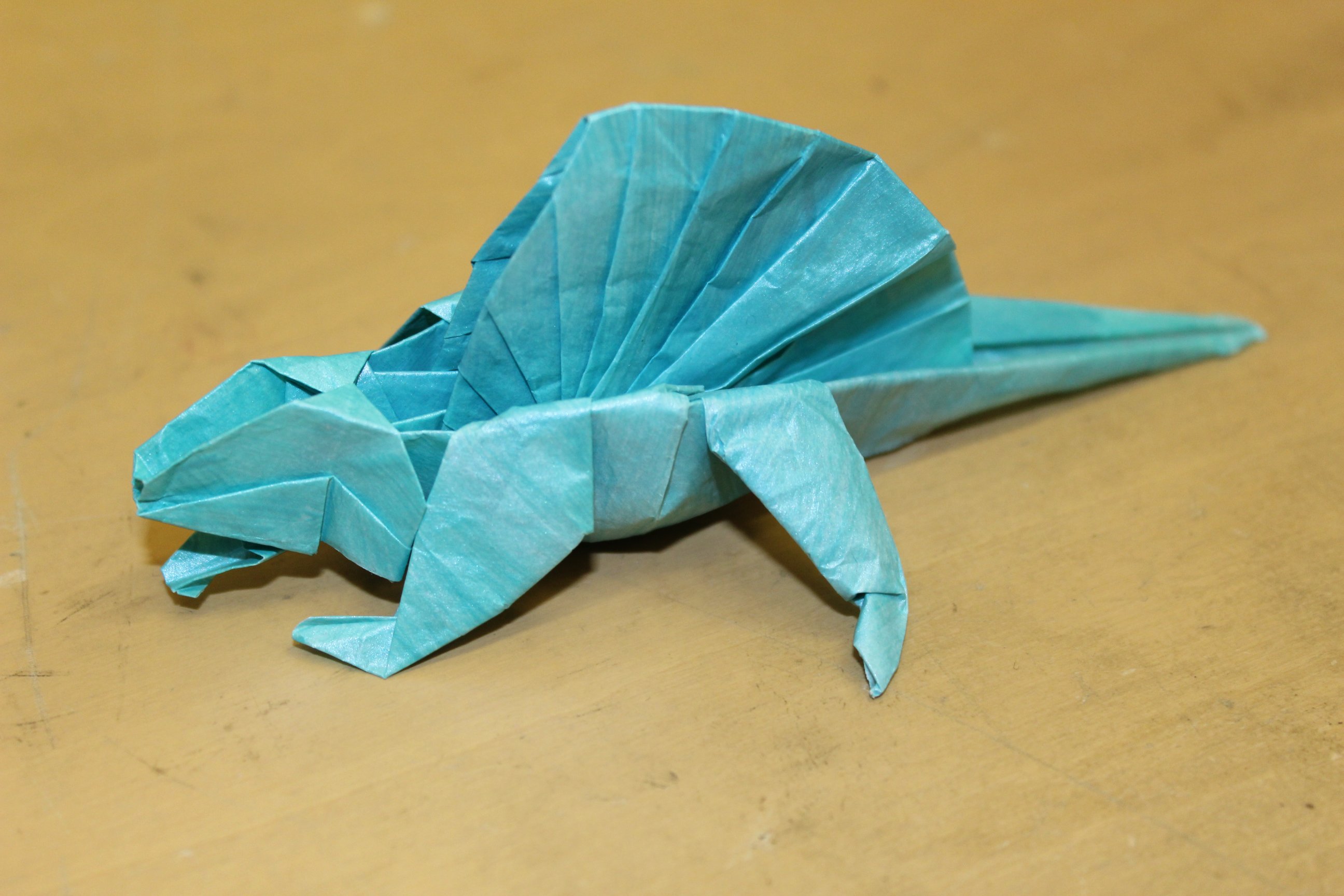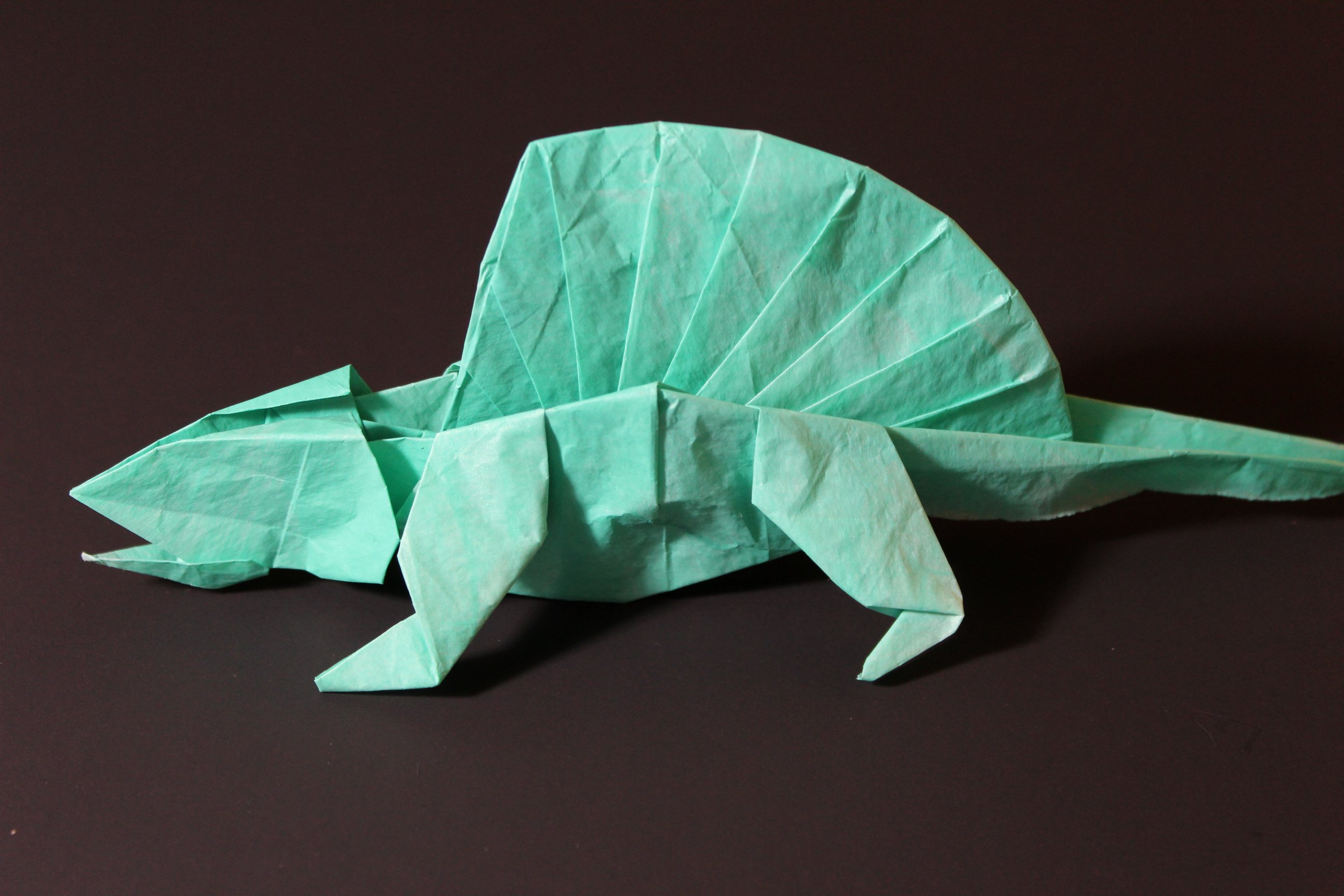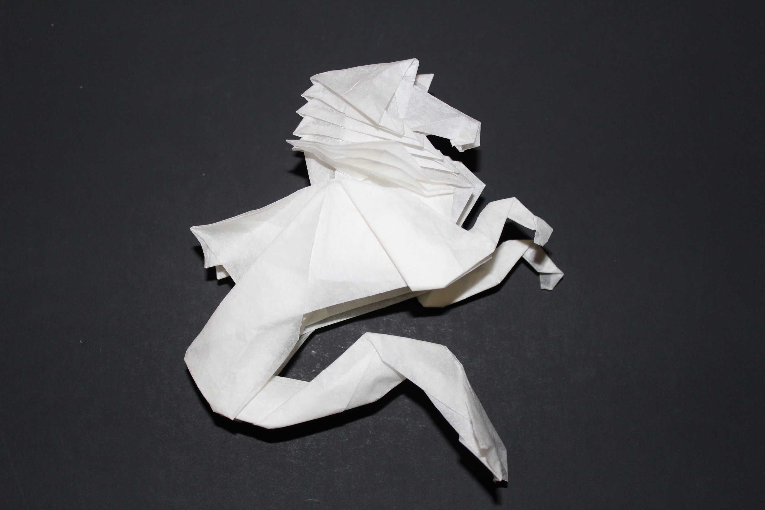 I have made this model before, and I’m pretty sure I managed to do the same stupid thing both times. The crease pattern is in OTM 59, but a new, more complex model of the head is diagrammed in 119. I keep thinking the new head is supposed to go on the crease pattern model. It might be doable, but, since I choose paper size based on the small head, it becomes really hard to fit the new one in. This time, I noticed the problem after I folded the updated head separately.